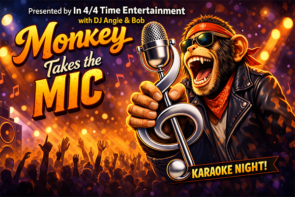 The Grotto Karaoke is flying to the Monkey stage for a special two‑week run of Monkey Takes the Mic while renovations are being done. It’s the same fun night you know, now with a full theater experience.